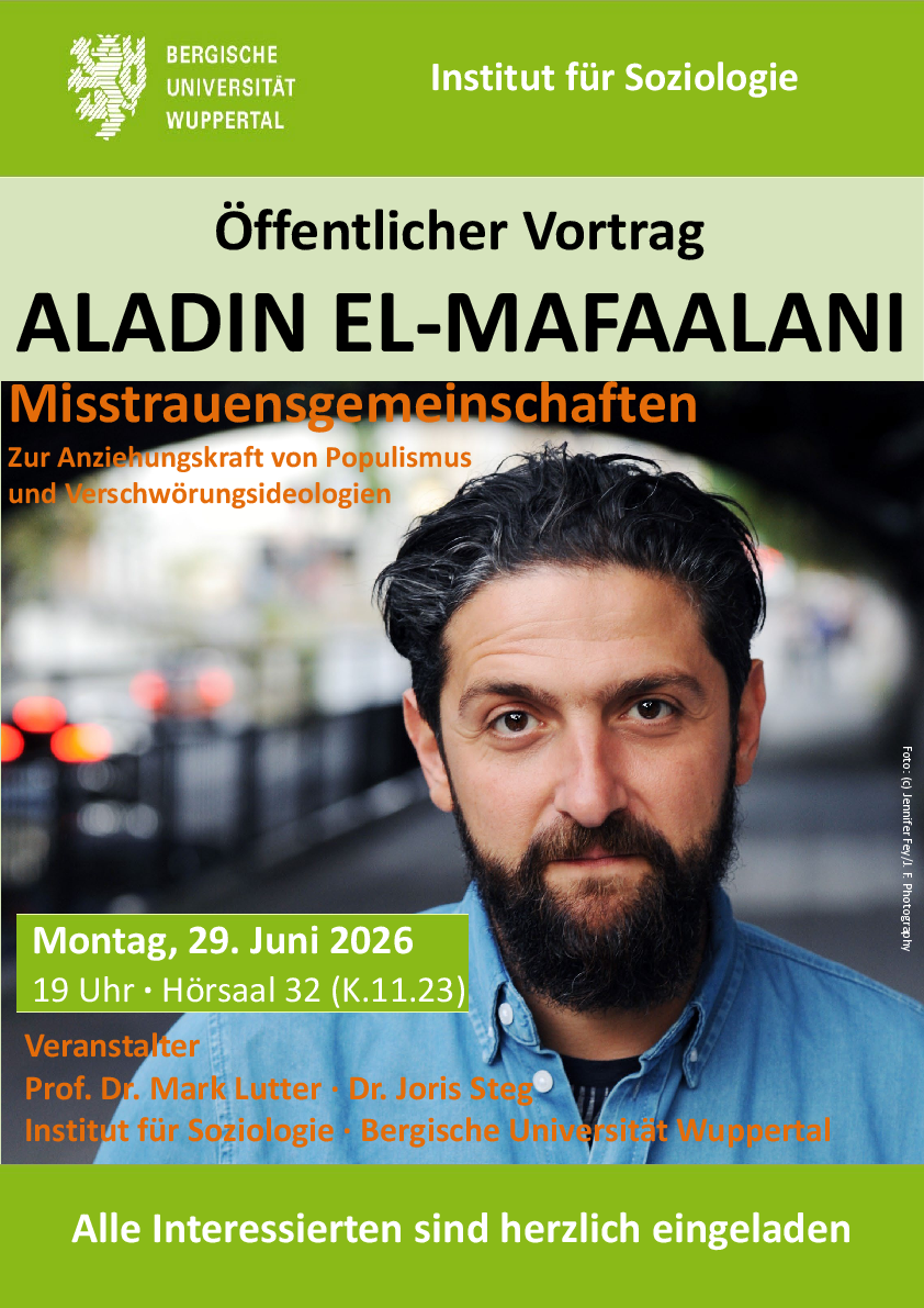 Prof. Dr. Aladin El-Mafaalani wird am Montag, den 29. Juni 2026, um 19 Uhr in Hörsaal 32 (K.11.23) einen Vortrag zum Thema "Misstrauensgemeinschaften. Zur Anziehungskraft von Populismus und Verschwörungsideologie" halten. Alle Interessierten sind herzlich eingeladen. Der Eintritt ist frei.